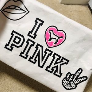 🆕PINK/VS REALLY CUTE CANVAS MATERIAL BAG THAT HAS A ALSO REALLY CUTE/SEE ALL PICS/WRITTEN IN (PINK)MARKER LIKE A SMALL SHARPIE/YOU CAN CUSTOMIZE YOUR BAG OR USE AS A COLLECTIBLE!!PLEASE SEE ALL PICS!!! NWT!!!