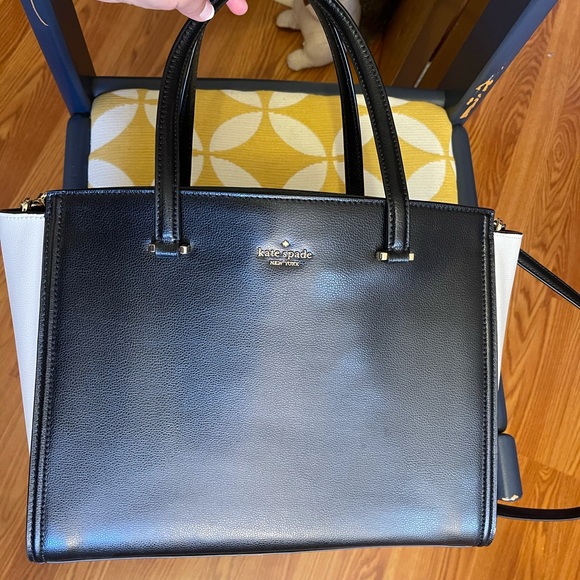 Large tote, has small handle straps as well as a longer shoulder strap. Inside pockets and small pocket on outside of bag!