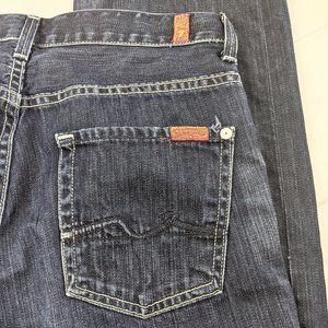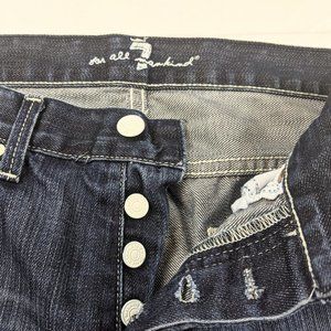 7 For All Mankind Men's Slouchy Straight Dark Blue Distressed Button Fly Jeans. These jeans have white buttons and rivets. The fabric also has distressing. It doesn't have a size tag, please refer to the measurements for sizing.