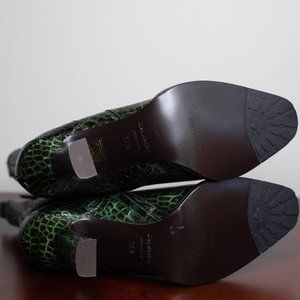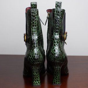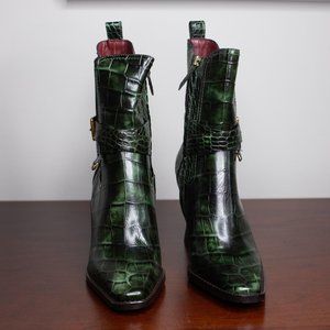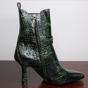 Green Naomy boots by Sies Marjan are crafted from crocodile-embossed leather and features a Chelsea-style silhouette, gold toned hardware, an elastic waist band for slip-on, and a loop tab. Style these super cool boots with a black asymmetric knit dress and a small leather bucket bag for any date night outfit.