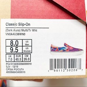 Throw some wild color into your footwear collection with the Vans Slip-On Dark Aura multi and true white skate shoes! Dark purple and blue color, contrasted by the patches of red and pink for a ton of eye-catching brilliance. Vans' signature cushioned footbed and flexible, vulcanized outsole.