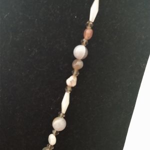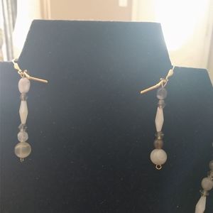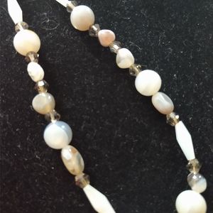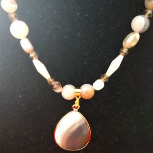 "BOTSWANA AGATE SMOKY TOPAZ BEAUTY". Nice gift. 2" GP lever backs. 4mm crystal smoky topaz bicone beads. Natural Botswana Agate pebble beads. White Jade luster beads. 18mm square toggle clasp. 8mm natural polished agate beads. 34mm brass edged natural gray Agate teardrop pendant. 6mm 22ga gold filled jump ring. 4mm gold filled crimp cover.