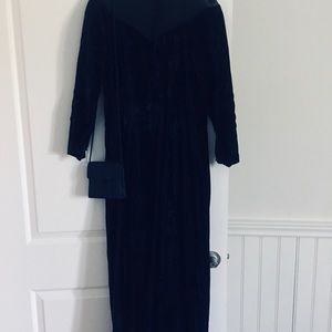 Dressmaker created from a designer dress photo. Midnight blue lined crushed velvet with stretchy matching net insert in bodice and back mock turtle neck, pointed long sleeves, fishtail hem, matching silk moire shoulder evening bag included.