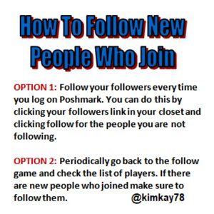 @jmcreations As new people join the game, they will follow you and you just have to follow them back. I click on the followers link at the top of my closet and follow back new followers from there. I find that method easier. Some people periodically go back to the game post and follow new people who joined from the list of likers of the page.