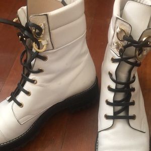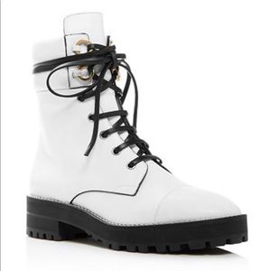 Gleaming grommets and a chunky lugged sole amp up the edgy attitude of a cap-toe combat bootie softened with a plush padded collar. Sizing: True to size. - Round toe - Cap toe - Lace-up vamp - Cushioned footbed - Approx. 6" shaft height - Approx. 1.75" heel; 1" platform - Stacked heel - Grip sole - Made in Spain