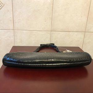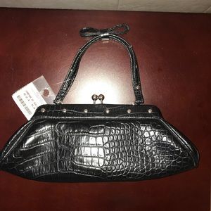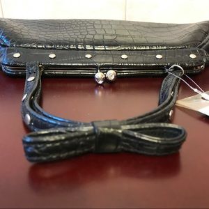 NWT JLO Jennifer Lopez handbag / purse / bag. Made of black croc-embossed faux leather with silvertone studded details. Kisslock closure with rhinestones. Studded handle with 4” drop & bow detail on top. Lined in pink satiny fabric. Inside has one zipper pocket with metal JLO logo plate. Please note that inside fabric has some discoloration from age—see photos for detail. Approx. 11”W (at widest) x 4.6”H x 1.5”D. See photo of bag next to a quarter for size reference. Smoke-free, pet-free home.