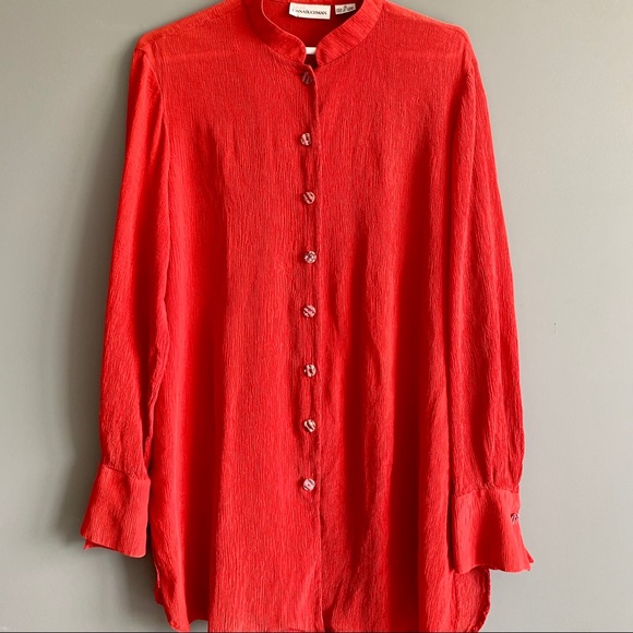 Beautiful, vintage button down shirt, 100% silk with a unique texture, sea shell buttons, and an oversized fit. The colour is super bright, and it’s in great condition. Makes a great addition to any top, or can be worn on its own!