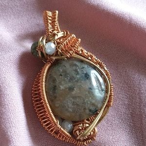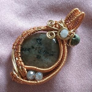 ๐จ๐ฆ Hand wire weaved with nickel free tarnish resistant brass, this pendant features a quartz and mica cabochon along with a Jasper Stone bead and 4 Swarovski cut Crystal glass beads.