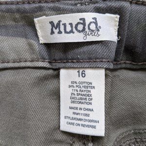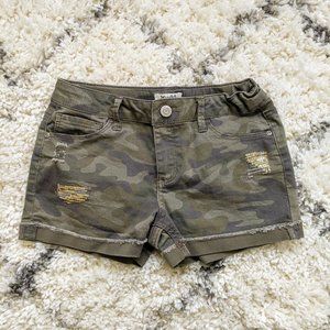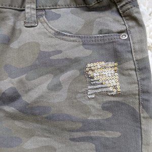 Barely worn before outgrowing. Faded green camouflage cuffed shorts with adjustable waist. Gold sequin details. Smoke and pet free home.