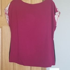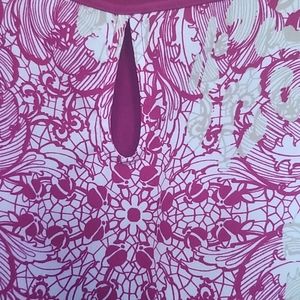 From the NY & Co "stretch" collection, this gorgeous top features a keyhole top and the pink back has a bit of stretch to give you the perfect fit. Front is pink, black, white with tan accents. Perfect for work or weekend.