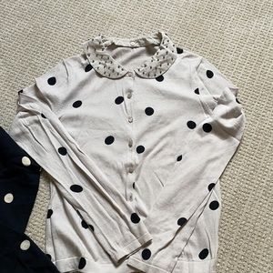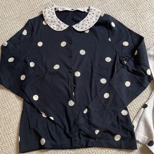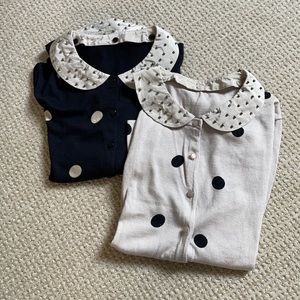 These super cute cardigans were purchased at Garnet Hill. There are no tags so they might have been samples. I believe they are a size small or extra small. The collars are detachable. Fabric appears to be some sort of silk blend. The black one was never worn. The beige one was worn once.