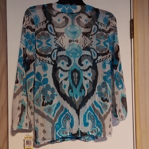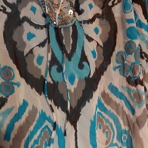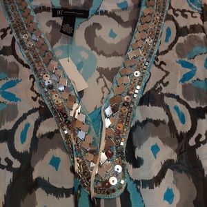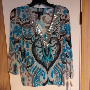 Beautiful INC top. Pretty silver bling at neck. Tie at neck. Tank underneath. Elastic at sleeves. Great spring top.