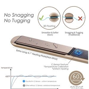 This Upgraded NITION fashion hair straightener is going to redefine the traditional straightener iron.It is not just a 2-IN-1 hair straightening & curling iron but also a healthy hair styling tool with innovative healthy styling(5-IN-1 Heating plate with 5 elements coated:Nano Silver * Aragon ● Ceramic ● Tourmaline ● Titanium).Those elements will great benefit the hair, leaves hair perfect