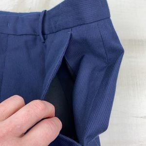 Herringbone cotton blend. Italian material. Straight cut, slightly fitted at bottom. Zip fly. Hidden hook & button closure at waist. Inset waistband. Belt loops. Lined waistband. Permanent creases front and back. Italian pockets. Back darts. Piped buttoned back pocket. Blindstitched hem