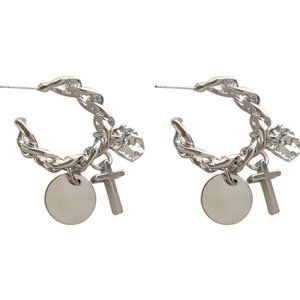 Chain Hoops with Circle charm, cross, silver hammered texture charm