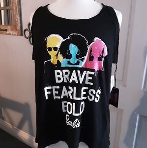 Barbie, brave fearless,bold jersey sleep tank. Scoop neck, shirtail hem. Jersey knit fabric.