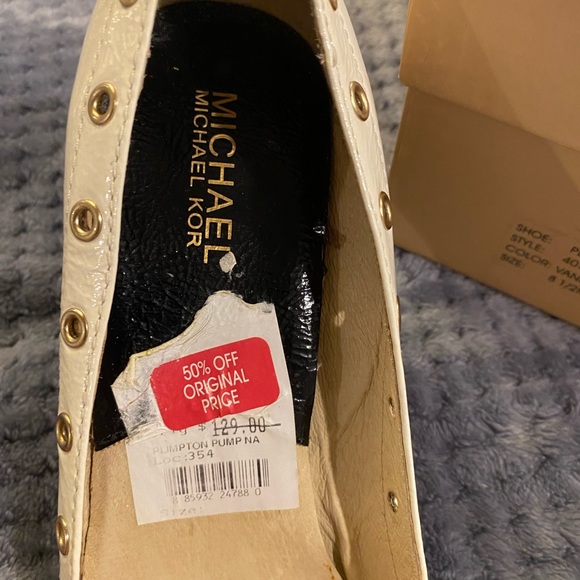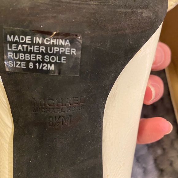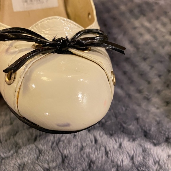 Worn 1X in good condition! Michael Kors Plimpton heels in Vanilla size 8.5. retailed 130 I saw them for 50% off I bought them despite being a size too big. Wore once to brunch and knew before I got to the door they weren’t going to work out and too big. I never got them returned. small smudge as pictured but on bottom so not visible. I love that they are classic and Jackie O. Buy them and feel like a Kennedy with the vanilla patent leather, darling black patent leather bow with brass grommets.