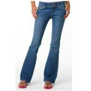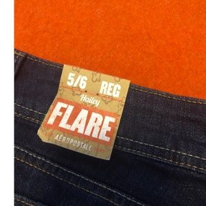 Aeropostale dark denim ‘Hailey’ low rise flare hipster jeans new with tags. Front and back pockets, zip and two buttons fastening. Marked size 5/6. All measurements are approximate and taken with the garment laying flat: Waist 15.5" Front rise 7.5" Inseam 28.5" This item comes from a smoke free, pets friendly home. Recycled bags/box used when possible.