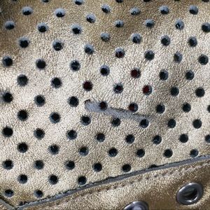 Handmade by MAÁ shoes in Spain these high top sneakers are soft as leather can get. Perforated leather upper,removable solid and soft insole, rubber outsole. Lace up closure. Color: shiny gold. Sz 37, US 7. Condition: pre -owned ( wear showing as pictured). Pls zoom in all pictures for details and condition. I use clean recycled
