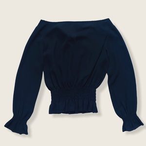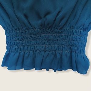 Sheer black blouse (Size S). Cute top! Can be tied at the neck or left with the strings hanging. Has elastic band at the waist.