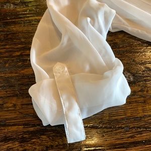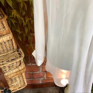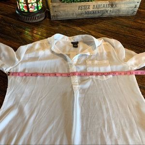 It’s pretty sheer, you’ll need a cami unless your daring 😉 🤣. Just kidding. Here is a pretty white top, XL in size. 1 Pocket. Use as long sleeve or roll tab arm. Curved hem. In good condition. See all photos for measurements and condition. Comes from a non smoking, puppy friendly place.