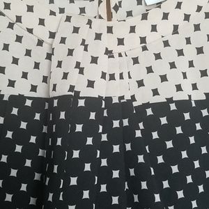 Cute black & tan sleeveless blouse. Diamond pattern, pleated toward neckline. Buttons in back, but don't need to undo to slip on. Looks good on it's own or layered with cardigan or blazer. Very good condition, has never been put in dryer.