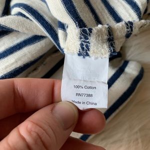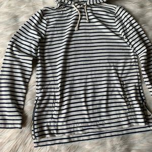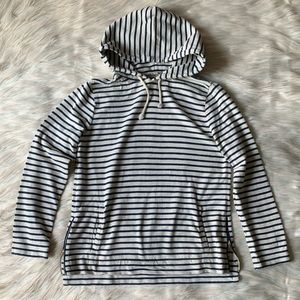 Pullover sweatshirt by J. Crew in off white and navy stripe. Hooded with drawstring. Two slant front pockets. Side zipper details. Long sleeves. Preowned and in good condition- hole at seam of sleeve as pictured- can easily be stitched. Approximate measurements: 19.25” armpit to armpit, 25.25” length.