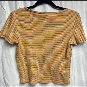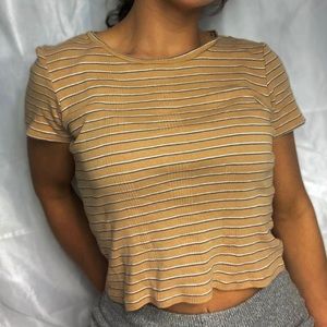 90’s vibes mustard ribbed cropped short sleeve tee with white and blue stripe detail