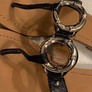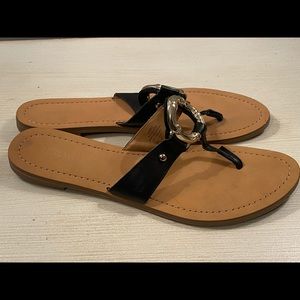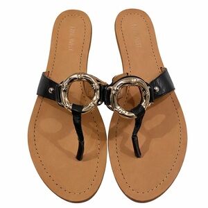 Nine West Chic Black Leather Thong Sandals Gold Accent Size 10