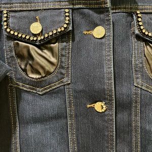 EUC Annabell dark denim jean jacket with faux leather like detail and crystal bling on shoulders, pockets and sleeves. Silver hardware with bling, fun jacket, great condition, no flaws.
