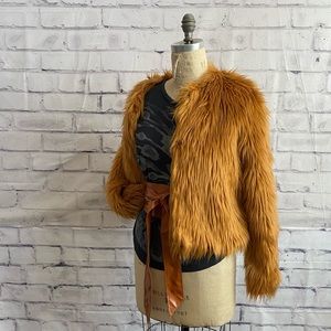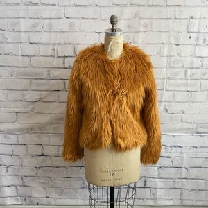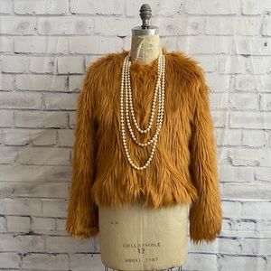 NWOT-Forever 21- plush camel color jacket. This is so adorable, I find it very dressy but you could dress it up or down. It reminds me of faux fox fur but it’s just this really plush camel color jacket, fully lined. it’s a size large but I find that F21 runs a little small.Never worn