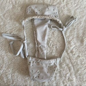 New without tags & never worn! Top & bottom are a size 0 (XS). Broderie detail. Was labeled a sage green color but is more of a light gray/off-white. Bottoms are cheekier in real life than on the model. Almost like a thong. Top has adjustable straps with a buckle closure. Bottoms have adjustable side ties. Has removable padding. I’m a 32A, a 24” waist, & 5’1 & this set fit well!