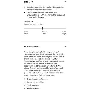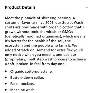 Meet the pinnacle of shirt engineering. A customer favorite since 2005, our Secret Wash shirts are now made with organic cotton that's grown without toxic chemicals or GMOs, We added Stretch on Demand for extra flex you'll only notice when you need it, and use our (proprietary) multistep wash process to achieve a soft, broken-in feel from day one.