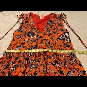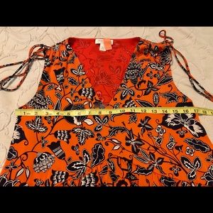 Fits more like a 4-6. Beautiful, elegant, comfy dress - longer in the back than the front, with matching red lining and silk ties at each shoulder. Please see photos for measurements, as this dress is much more generously cut than a normal size 2. Worn once, then professionally dry cleaned. Lovingly cared for in a smoke free home.