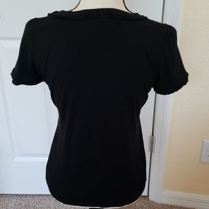 This is an adorable black Bay Studio top! It has two flowers of the same fabric as the shirt on one shoulder. It has a subtle ruffle trim around the neckline and sleeves - also the same fabric. It's dressy enough for career or date night, and casual enough to dress up a pair of shorts, slacks or jeans.