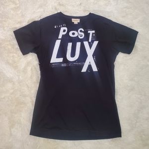 - Black shirt sleeve t shirt with diesel Post Lux white graphic on front
