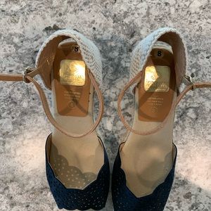 New Kanna espadrilles, made in Spain. Weave heel with leather ankle strap. Toe is cut out patterns in navy blue suede. Platform is covered Jute with braided design. Rubber non slip bottoms. I wear a 7.5-8 shoe these would fit a size 8-8.5. Please measure inside of your shoe to insure perfect size.