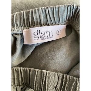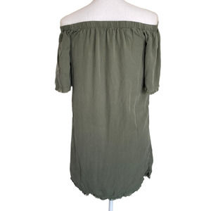 Glam Olive Green Off The Shoulder Tunic Top. American made and 100% Tencel. Trendy raw hems and large front pockets. Excellent preowned condition, no rips, holes or stains. Size small.