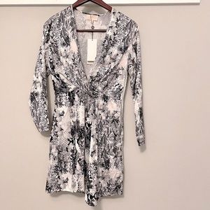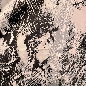 Club London polyester dress with thin satin feel. Very pale pink with snake print. Plunging twist neckline and faux wrap at the waist. Super cute! A bit on the short side.