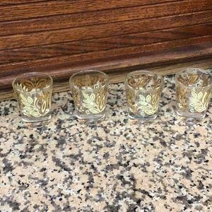 Beautiful set of four vintage glasses featuring delicate gold and cream butterfly and leaf motifs. The design is intricate and stylized, with swirling foliage that evokes classic mid century elegance. Each glass is in excellent vintage condition with no chips, cracks, or repairs.