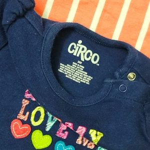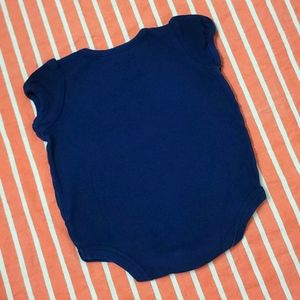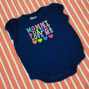 Dark blue onesie w/'Mommy & Daddy Love Me' printed in multiple bright colors on front center, right above a row of matching hearts. Onesie has a button on left side of collar. Onesie is in excellent used condition w/no stains, fading, discoloration, holes, rips or other obvious signs of wear. 💙👨👩👧💗