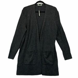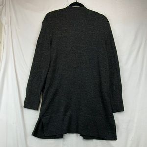 Long line, open front sweater cardigan with pockets. Wool blend. Charcoal with hints of blue and red threads. Super soft and cozy. Pit to pit 23" and length 35". New with tags.