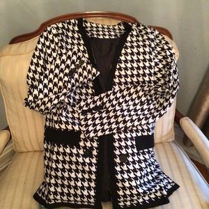 Stunning black and white houndstooth jacket will instantly add style and class to any outfit. Black trimmed lapels and black buttons accent this classic wardrobe piece ❤️🌼Fully lined, button accents on both cuffs. Polyester, spandex blend❤️