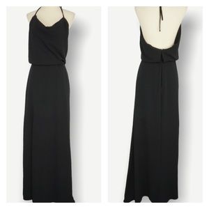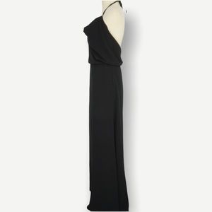 A soaring slit and open back bring a little drama to this stunning crepe gown destined to be spun around the dance floor.