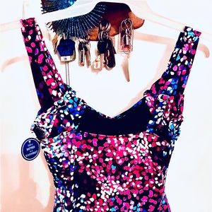 This stunner of a Tankini top is here and just in time for beach 🏖 & pool season! With its eye catching, explosive, 🧨 firecracker-of-color design, it’s sure to turn heads wherever you go! In addition to its outstanding design, it features waist & all-over slimming construction! It’s bands surrounding the front straps add an additional rare stylistic trait! You can’t lose with this one!