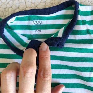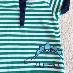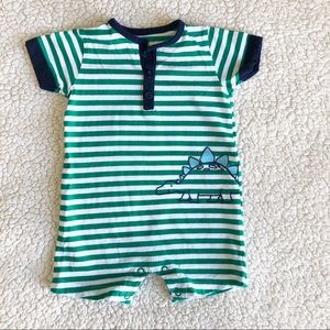 Pre-owned in excellent condition. Cute summer romper for the little guy to stay cool. Green and white stripes with a dinosaur design on the side. Front buttons and inseam snap closures for easy diaper changing.