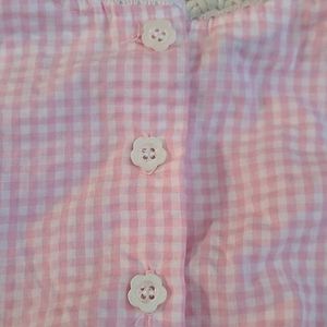 THE PRETTIEST DRESS AND HAT ..IN PINK WHITE PURPLE AND GREEN COLORS .THREE PRETTY FLOWERS LINE THE WAIST OF THE DRESS WITH WHITE TRIM .ON SHORT SLEEVES HAS WHITE TRIM TOO..HAT HAS PINK AND WHITE FLOWER ON IT WITH FLOPPY BRIM. AND WHITE TIE RIBBON. WHITE FLOWER BUTTONS (3) ON THE BACK FOR CLOUSURE, ALSO HAS A CUTE TIE .SUPER CUTE LIKE NEW
