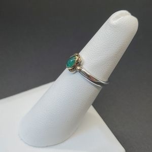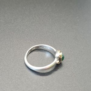 Designer ring by Steven Battelle. A brilliant oval emerald is surrounded by an 18k setting mounted on a silver band. Battelle is known for using exquisite gems and metals to make OOAK pieces.
