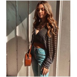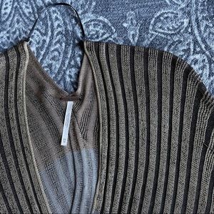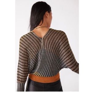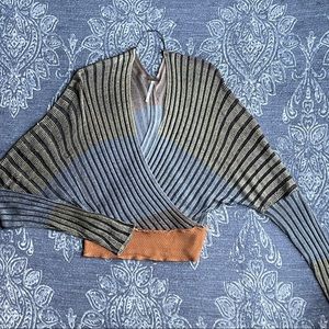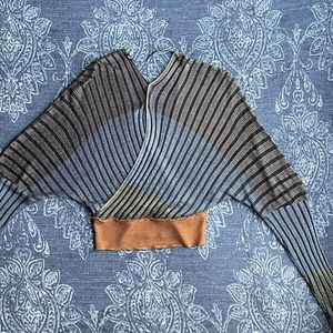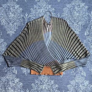 Has a few small pulls due to its delicateness (see pics), otherwise great condition. Labeled Size XS. A richly textured rib styles a loose-fitting top in a wrap-inspired silhouette with a surplice neck and banded hem. Semi-sheer.