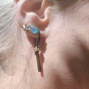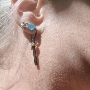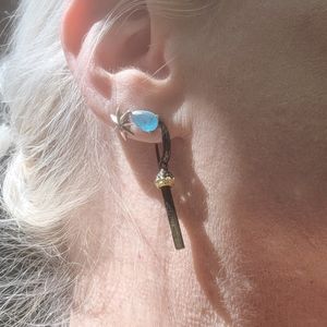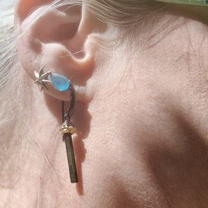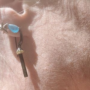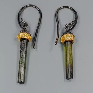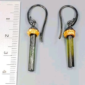 This is another NEW handmade green natural tourmaline pillar earring set in my 2021 Spring Collection "Dark Kharma". These stones are a little more bright. In my opinion, they aren't dark like the other stones in the collection. These are are made with 925 sterling silver covered in rhodium and 24k gold used on the findings. They are close to 2" inches in total length.